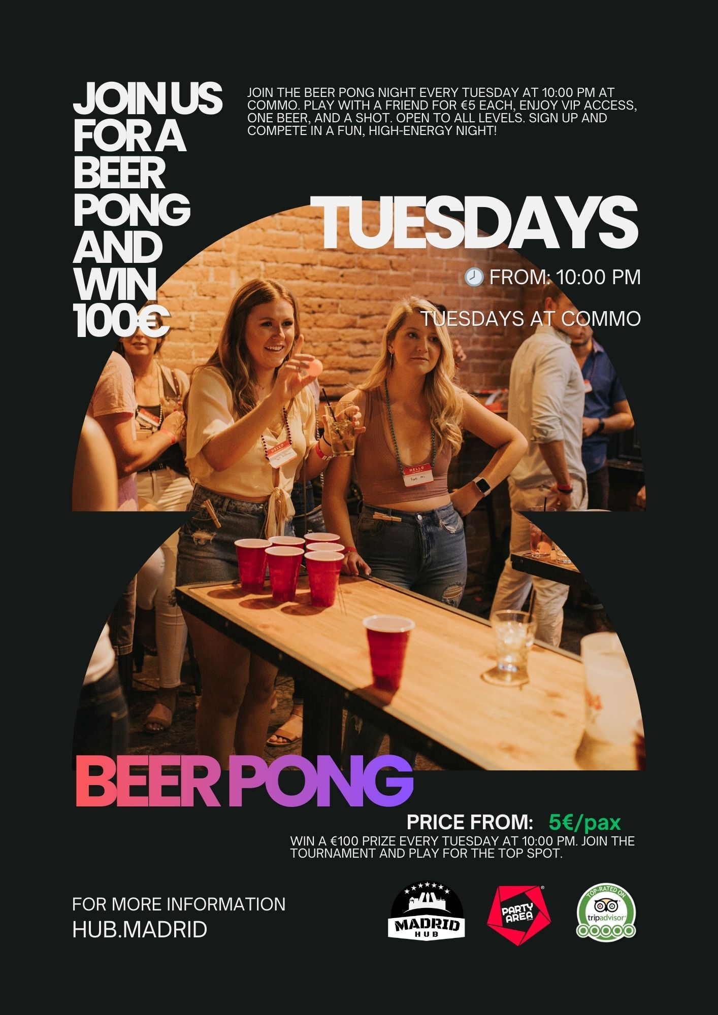 Join the Beer Pong Tournament in Madrid every Tuesday at 10:00 PM at Commo. Participate with a friend for just €5 each and compete for a €100 prize. Includes VIP access, one beer, and a shot per personOpen to all, from beginners to pros. Sign up and enjoy a night of fun and competition!