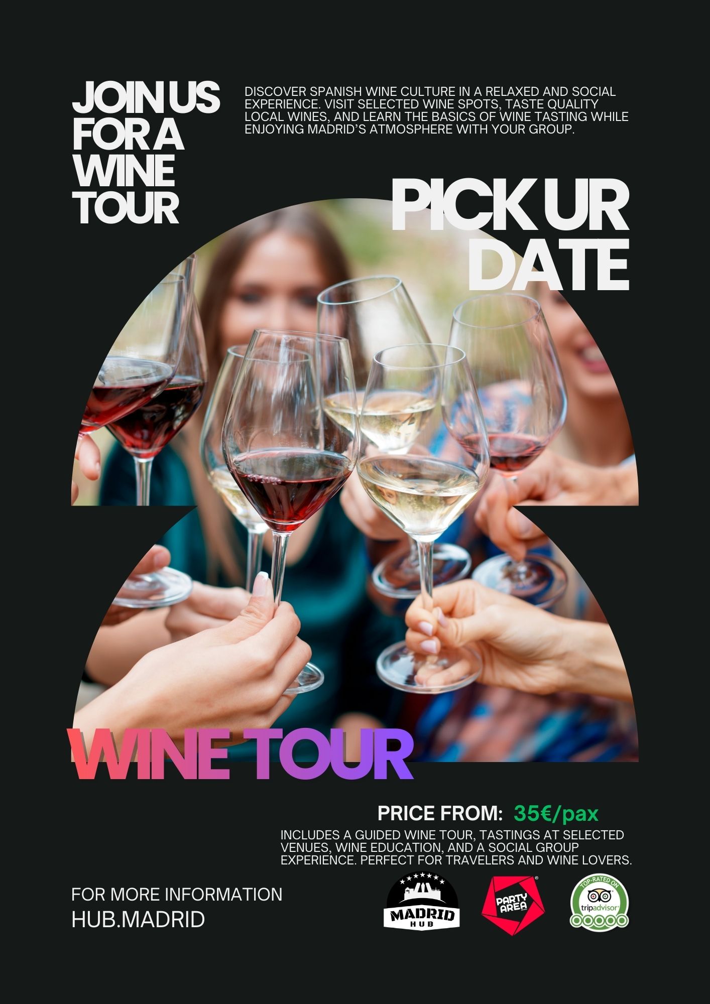 Hosted at some of the finest venues in the city, this experience offers not only a taste of exceptional Spanish cuisine but also an authentic immersion into Madrid’s vibrant gastronomic culture. Our expert sommeliers and hosts will guide you through the art of wine tasting, sharing fascinating insights into the origins, production, and pairing of each wine.